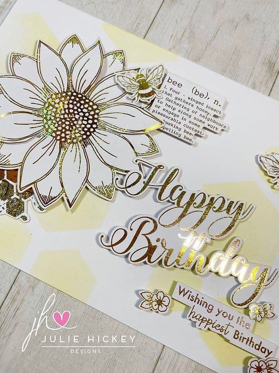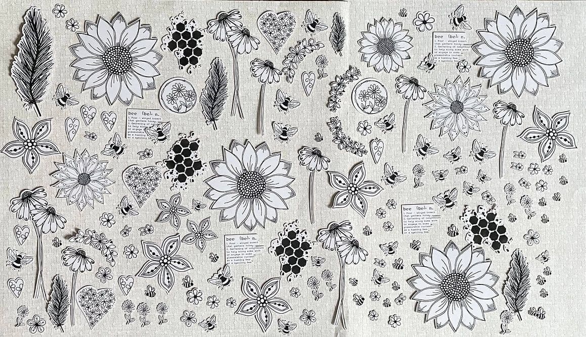 A beautiful collection of Julie's hand illustrations, 161 die cut sunflowers, blooms, feathers, text and lots of bee-autiful bumble bees in assorted designs and sizes. This product has been created using a toner printer and can be foiled using a toner foil through a laminator, or using an iron, or heat foiling machine. We love WOW! Embossing Fab Foils for this technique.