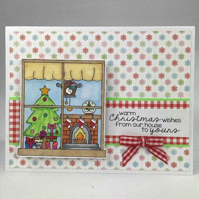 This 3x4 inch stamp set has a sweet view into a warm holiday home, complete with decorations and stockings hung with care.