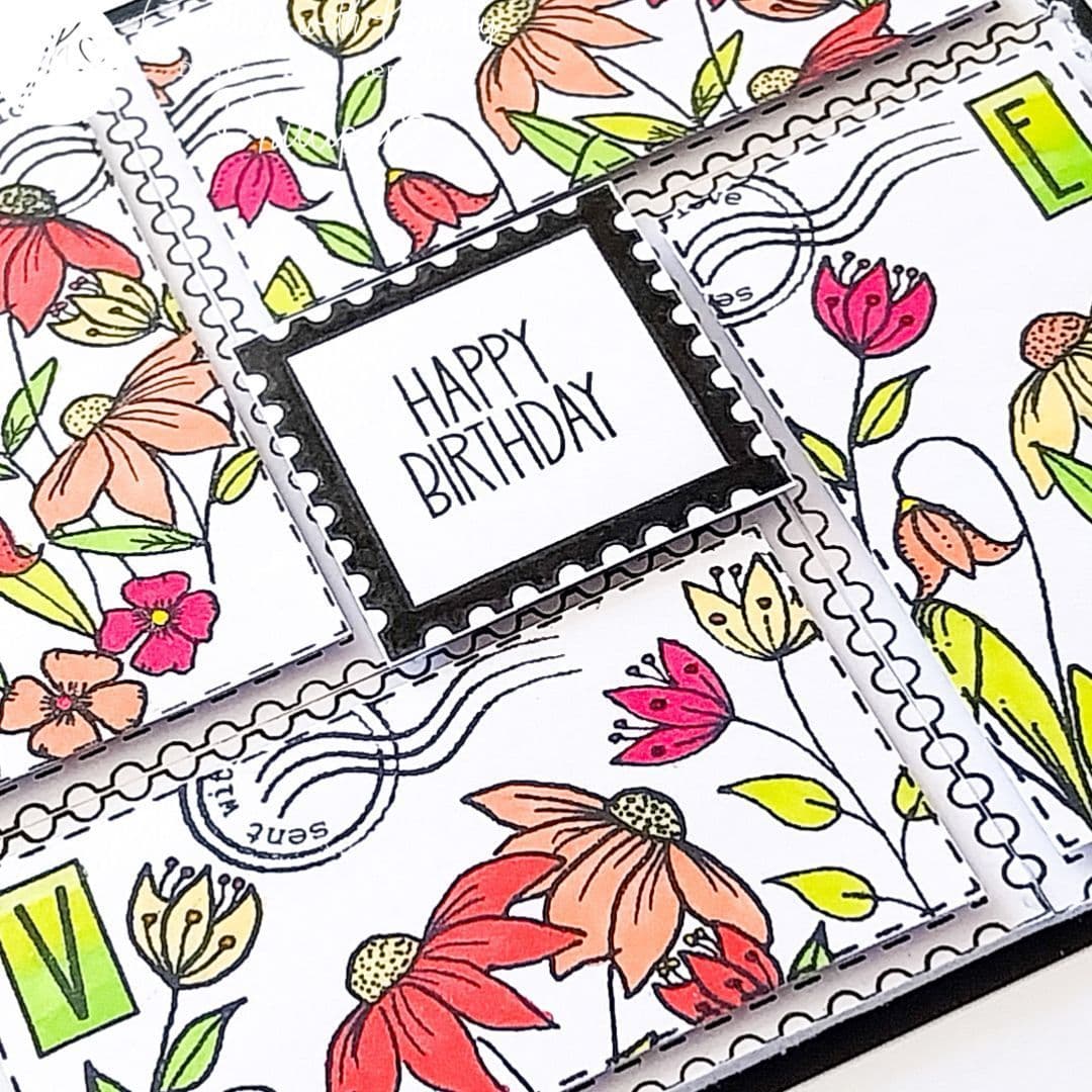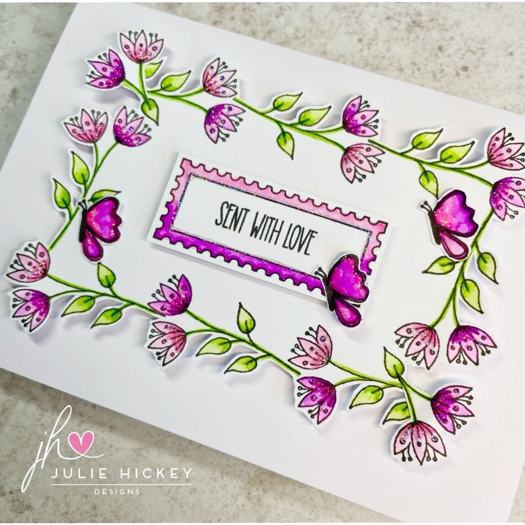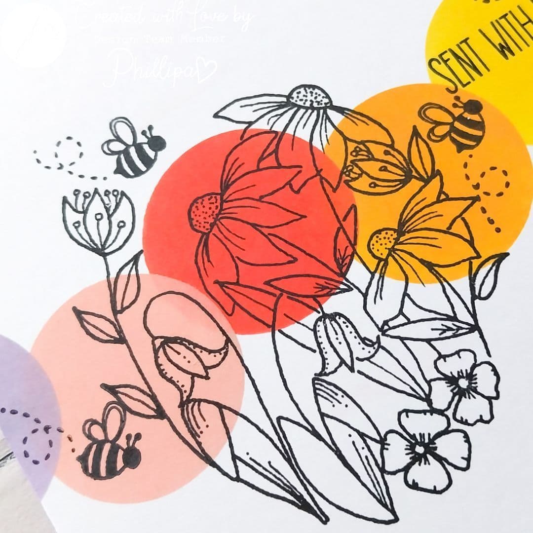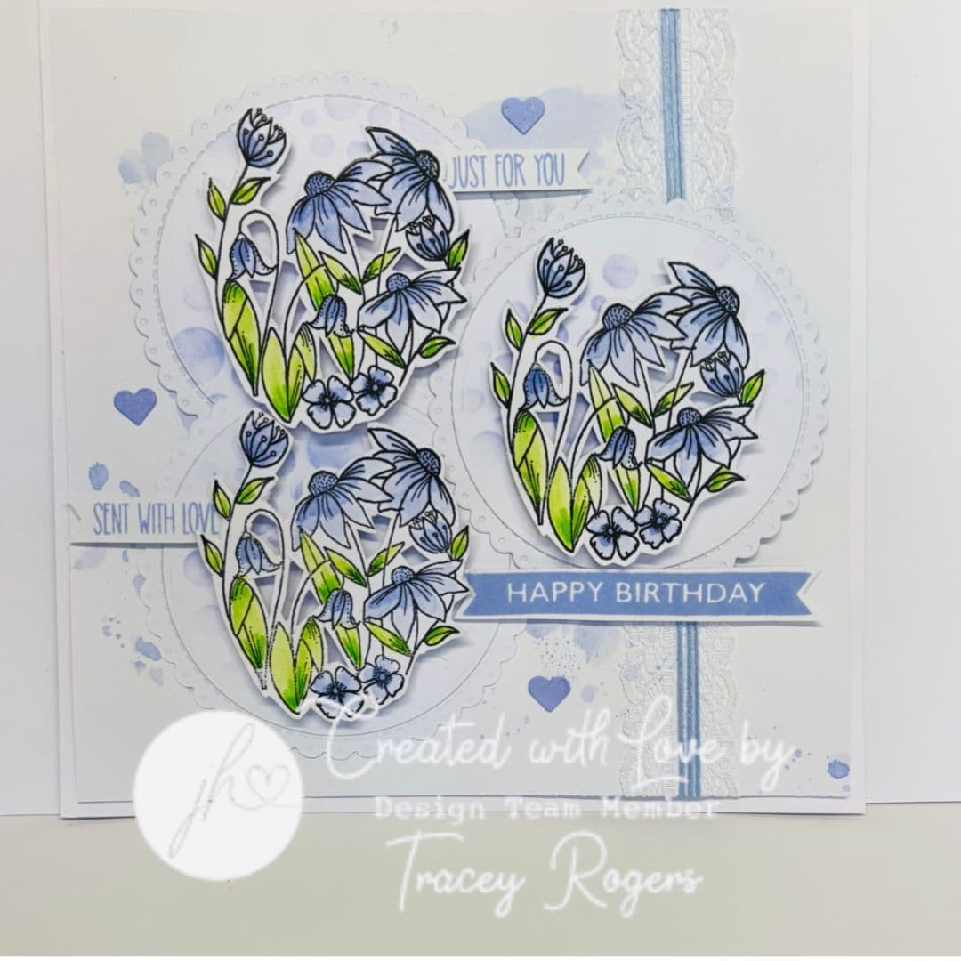 Comprising: 9 individual stamps featuring delightful contemporary hand drawn floral designs. Large oval floral arrangement - fits perfectly in my Shapes #1 Oval Stencil, 2x smaller floral designs, butterfly, bee and dotty trail with 3x Sentiments: Birthday Wishes, Just for you and Sent with Love.