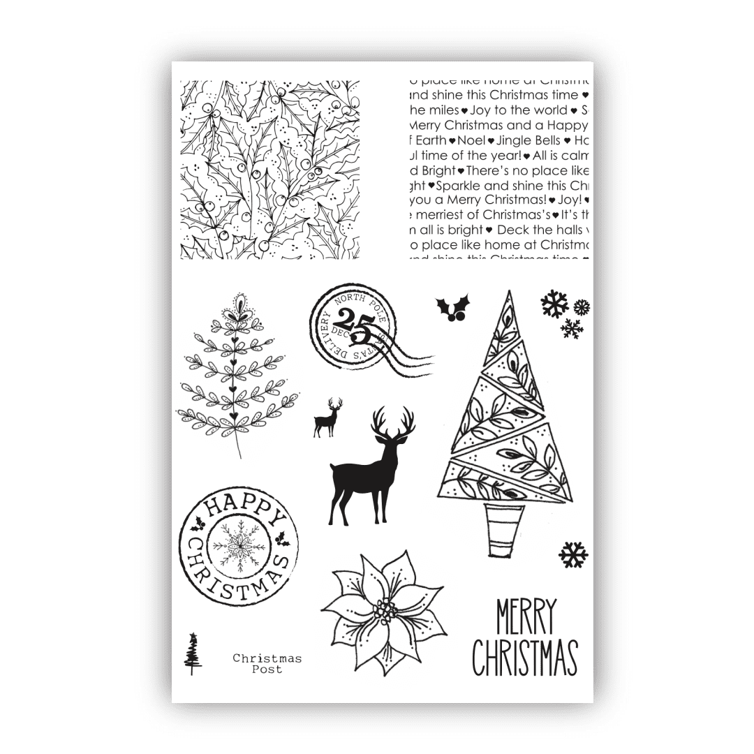 Comprising: 15 individual stamps featuring contemporary stamp designs 2 background squares 1x Holly and Berries and 1x Christmas Wording, together with small solid designs: Holly, Snowflake Cluster, Deer, Tree and single Snowflake. There are 2x different sized and style of Christmas Tree, 2x Postage marks 1x Happy Christmas and 1x 25 Dec North Pole Delivery with a Poinsettia and 2x sentiments Merry Christmas and tiny Christmas Post.